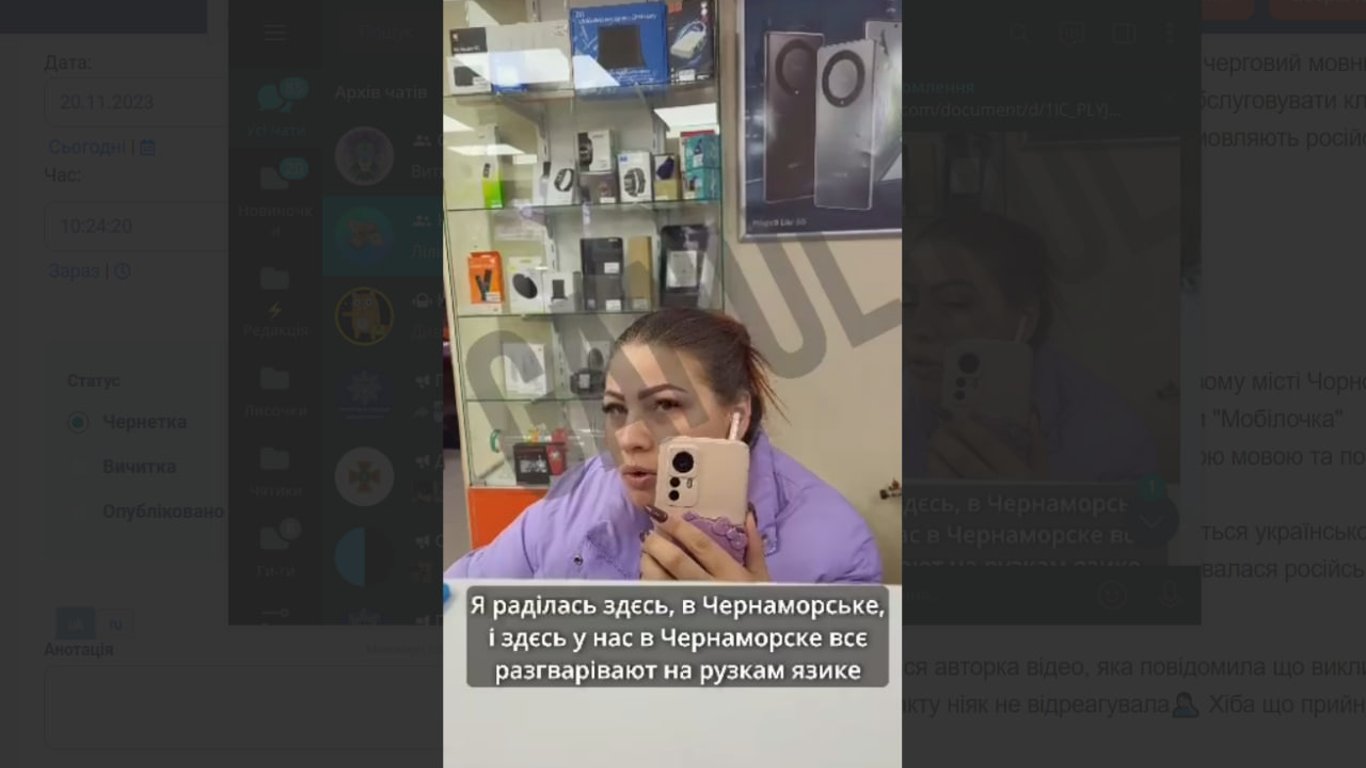 Продавчиня магазину електронної техніки відмовилася обслуговувати дівчину державною мовою та поводила себе нахабно. Жінка погрожувала клієнтці охороною, якщо та не припине тему мовного питання у сфері обслуговування. Крім того, називала покупницю "западенкою" та наголошувала, що у Чорноморську "цією мовою не говорять". Наразі відомо, що клієнтка магазину написала заяву до поліції щодо порушення мовного закону.