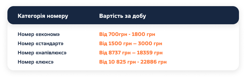 Вартість одномісного номера на добу коливається від 700 грн до 23 000 грн залежно від класу.