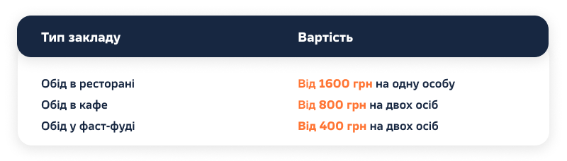 Що стосується цін на їжу, то тут кожен обирає для себе найбільш прийнятний варіант. Для любителів вишуканих страв ресторатори радять не зупинятися в одному ресторані чи кафе, а весь час відкривати для себе особливості місцевої кухні. У середньому вартість обіду на двох осіб обійдеться від 400 грн до 3000 грн.