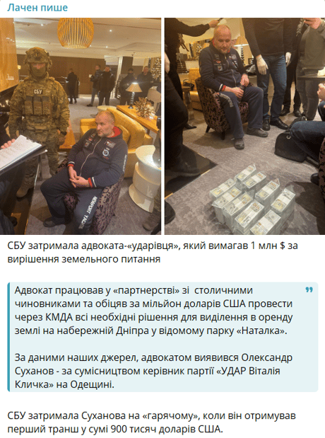 За інформацією блогера, адвокат нібито обіцяв за 1 млн доларів провести через Київську міську державну адміністрацію необхідні рішення для виділення в оренду земельної ділянки у парку "Наталка" на набережній Дніпра. Його затримали під час отримання першого траншу у сумі 900 тис. доларів.