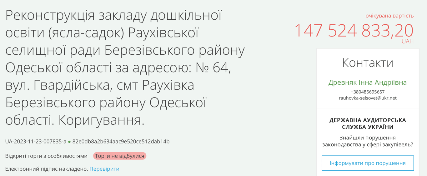 За інформацією порталу електронних закупівель, замовником так само стала Раухівська сільська рада, яка готова витрати на реконструкцію сховища 147,5 мільйонів гривень.