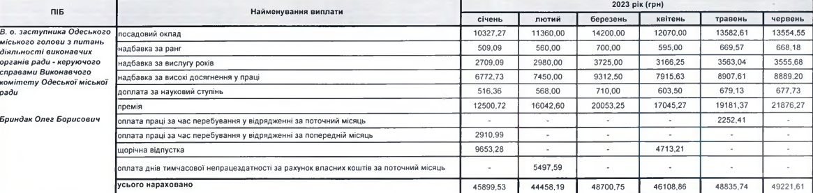 А от виконувач обов'язків заступника мера Олег Бриндак за пів року отримав понад 270 тисяч гривень, з яких найбільше чиновник отримав у червні цього року — 49 221, а найменше у лютому — 44 458 гривень.
