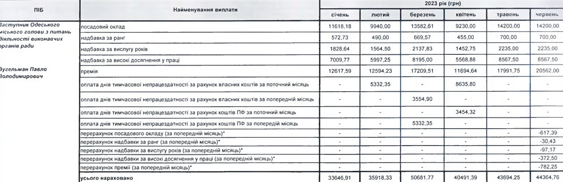 Павло Вугельман, ще один заступник голови міста, за минулий період 2023 року отримав понад 240 тисяч гривень за свої заслуги. Виходить, що його середньомісячна зарплата складає близько 42 тисяч гривень. Проте Вугельман поки не ходив у відпустку, тому про найбільш прибутковий місяць говорити зарано, а от найменший дохід він отримав у січні — 33 646 гривень.