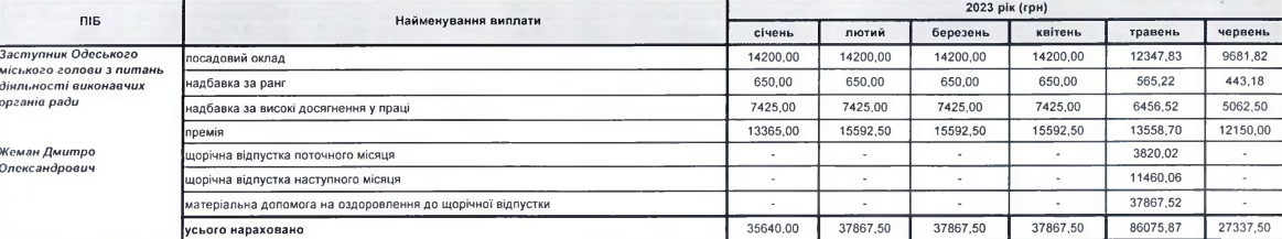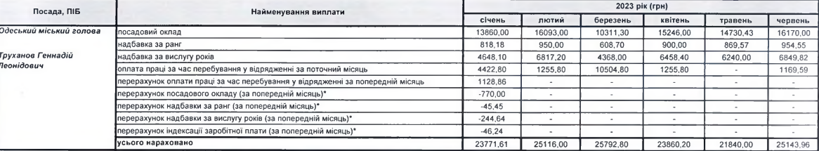 За перше півріччя 2023 року на зарплати керівників Одеської міської ради з бюджету пішло понад мільйон гривень, а саме 1 196 416. З яких 145 тисяч — офіційний дохід мера міста Геннадія Труханова.