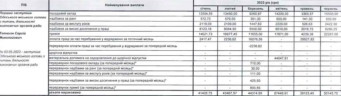 Першому заступнику Одеського міського голови Сергію Тетюхіну нарахували за той самий період понад 250 тисяч гривень зарплатні. Зазначимо, що це виплати з урахуванням виплат матеріальної допомоги на час відпустки. Наразі середньомісячний дохід чиновника складає близько 40 тисяч.