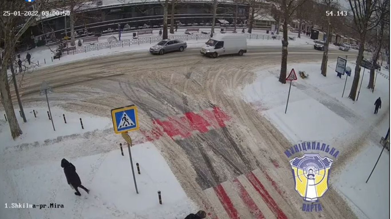 На опублікованому відео видно, що на засніженій дорозі легковик починає повертати. В цей час його "наздоганяє" мікроавтобус. Відбувається удар і мікроавтобус їде.