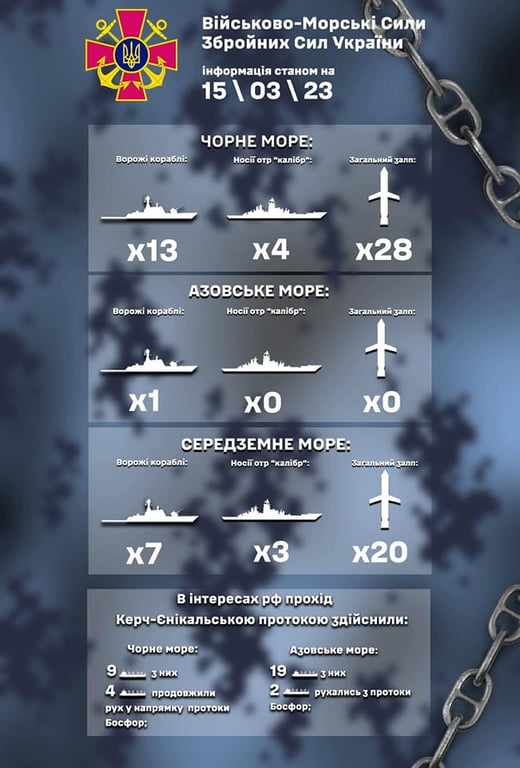 - в Середземному морі до 7 ворожих кораблів, з них 3 — носії крилатих ракет "Калібр", загальний залп до 20 ракет;