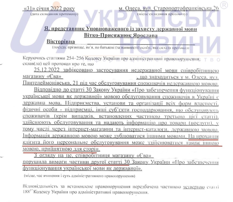 ЗМІ повідомляють про оштрафування касирки в Одесі за перехід на російську мову. Працівниця магазину це зробила, аби пояснити покупцеві склад крему.
