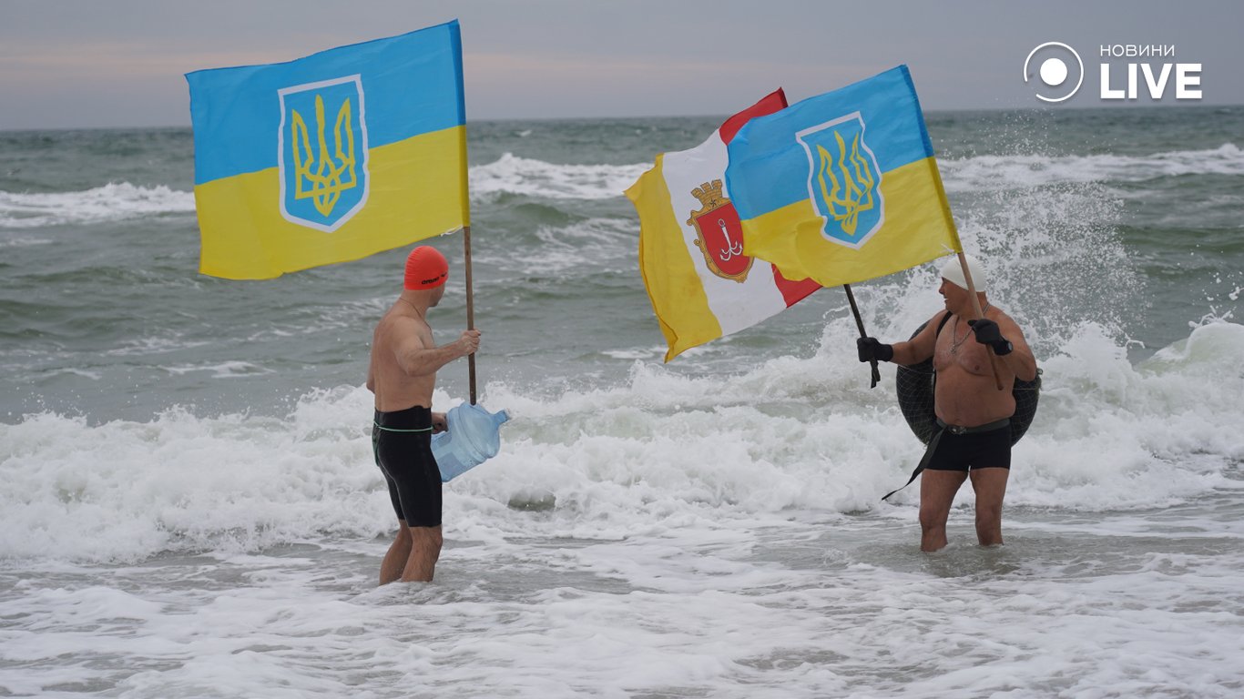 Члени "Клубу моржів" Одеси зібралися вдень 6 січня для купання на пляжі "Ланжерон". Вони влаштували традиційний заплив зі стягами міста та України.
