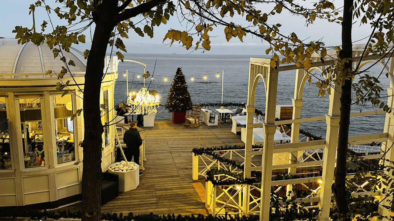 На терасі одного з кафе встановили одразу дві ялинки — і вони абсолютно різні. Одна стоїть у металевій конструкції, немов у пляшці, подарованій самому морю. Інша — традиційна, у глибоких червоних тонах, з класичними прикрасами та мʼяким сяйвом свічників. Поряд поставили крісло-гойдалку, яке ніби запрошує на кілька хвилин забути про справи й просто подивитися, як хвилі набігають на берег.