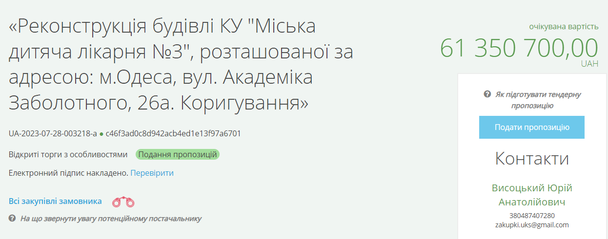 За даними відкритого аукціону, Одеська міська рада шукає підрядника, який виконає капітальний ремонт деяких частин лікарні та замінить комунікації.