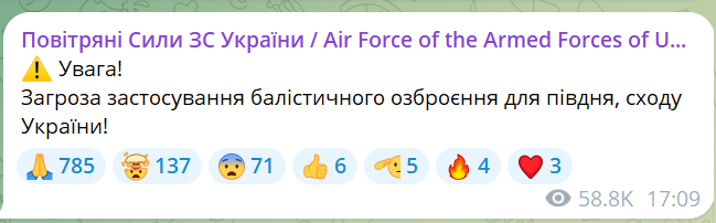 В Одесі та області оголошено повітряну тривогу. Це повʼязано з загрозою балістичного обстрілу на півдні України.