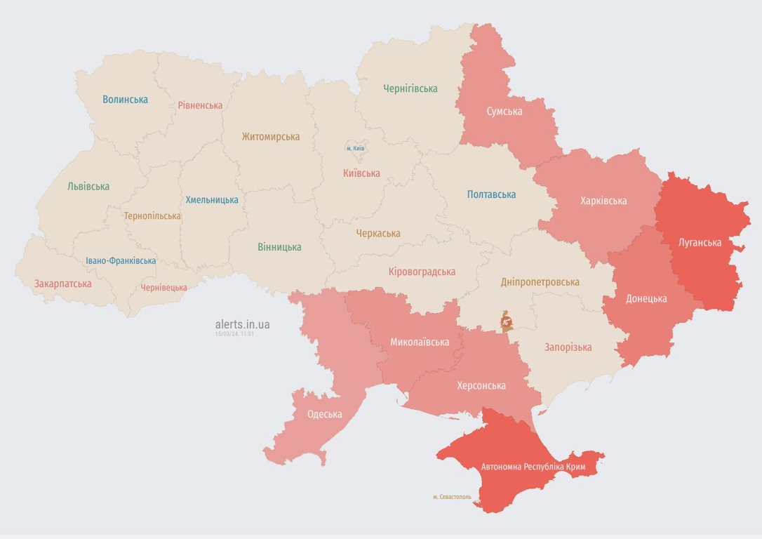 Наразі повітряна тривога звучить в Одеській, Миколаївській, Херсонській, Сумській та Харківській областях. Також на карті червоним кольором позначені Донецька та Луганська області і тимчасово окупований Крим.