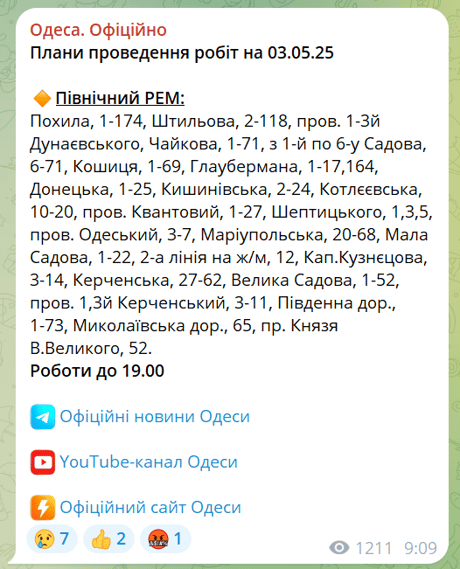 Сьогодні, 3 травня, жителі Одеси зіткнуться з тимчасовими відключеннями світла через ремонти на електромережах. Роботи проводитимуться енергетиками з Північного РЕМ, і триватимуть до вечора.