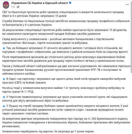 За їхньою інформацією, в Одесі затримали ділка "на гарячому", коли він намагався продати саморобні вибухові пристрої, бойові гранати Ф-1 та РГД. У ході обшуку вилучено майже 1 кг тротилу та небезпечні боєприпаси. Йому загрожує до 7 років позбавлення волі.