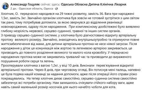 В Одеській області медики врятували передчасно народженого хлопчика, який з'явився на світ на 29 тижні вагітності. Немовля, яке потребувало негайної допомоги, пережило складну операцію, і тепер його стан стабільно покращується.