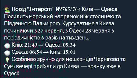"Особливо зручно для мешканців Чернігова та Сум: вечері приїхали до Києва — зранку вже в Одесі!" — йдеться у повідомленні Укрзалізниці.