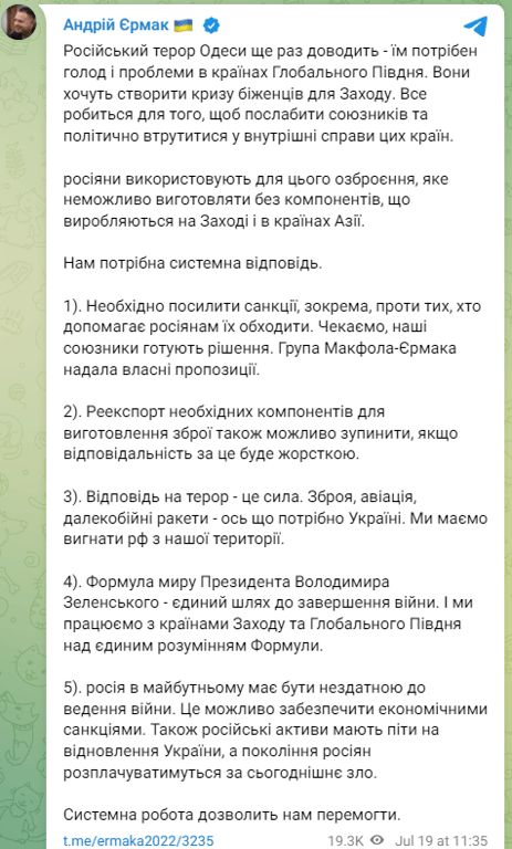 "Російський терор Одеси ще раз доводить — їм потрібен голод і проблеми в країнах Глобального Півдня. Вони хочуть створити кризу біженців для Заходу. Все робиться для того, щоб послабити союзників та політично втрутитися у внутрішні справи цих країн. Росіяни використовують для цього озброєння, яке неможливо виготовляти без компонентів, що виробляються на Заході і в країнах Азії", — написав Андрій Єрмак.