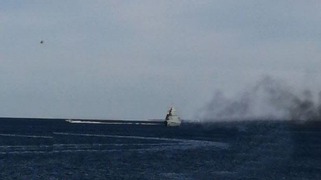 Оновлено 11:45. У місцевих ЗМІ з'явилася уточнена інформація, що корабель на рейді — це патрульний "Василь Биков", а не мрк "Буян-М". Відомо, що підводний ракетоносій виконував навчання, а "Биков" пустив маскувальний чорний дим", який збігся з підводним вибухом.