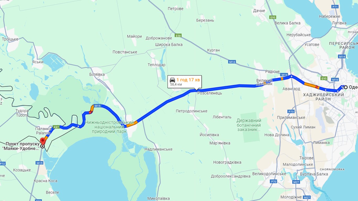 У бік пункту пропуску "Паланка — Маяки — Удобне" спостерігаються затори на виїзді з Одеси. Також є значне скупчення машин біля населеного пункту Маяки, на КПП у межах Нижньодністровського нацпарку та на автомобільному пункті пропуску. Ускладнені ділянки на карті позначені червоним та помаранчевим кольором. До молдавського кордону в п'ятницю ввечері можна дістатися за 1 годину 17 хвилин.