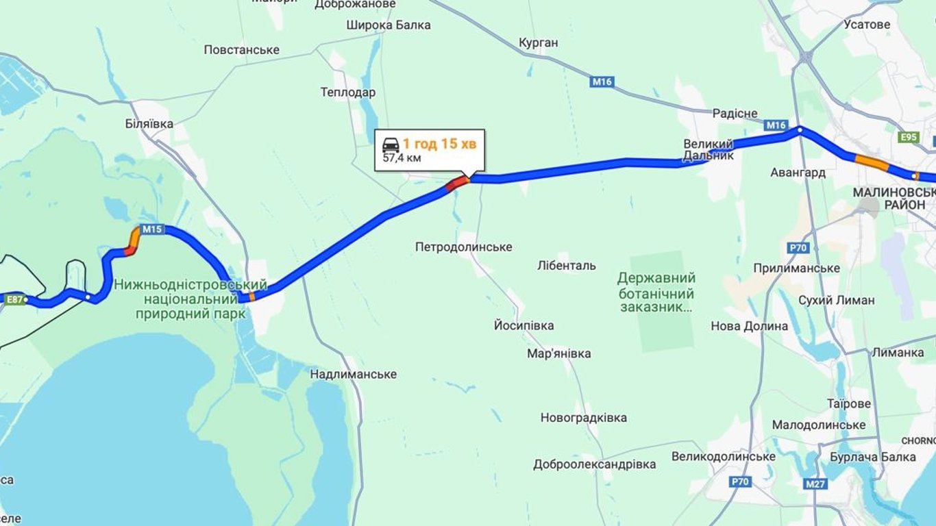 Крім того, на міжнародній трасі М-15 на півдні Одеської області також зафіксовано скупчення машин біля Сарати, Холмського та Сафʼян. Перед самим КПП дорога вільна і, за даними картографічного сервісу, становитиме 4 години 19 хвилин.