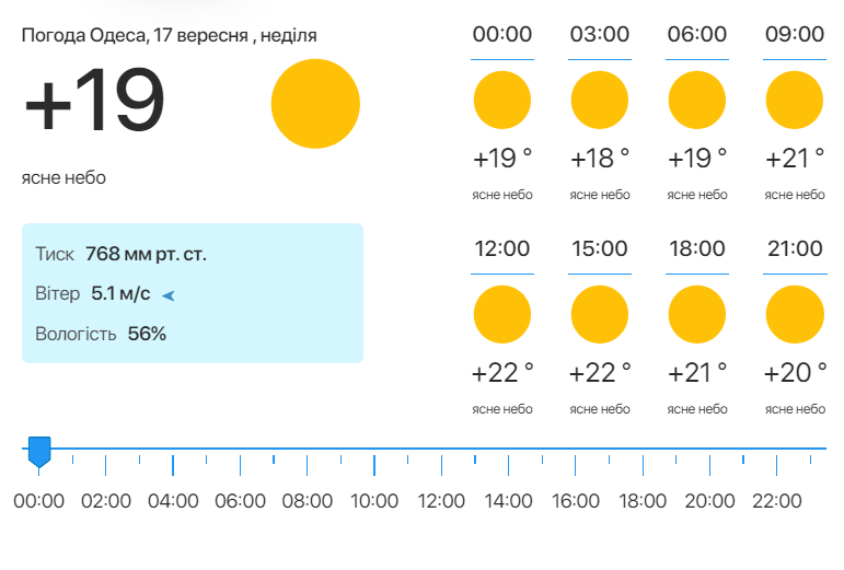 Сьогодні, 17 вересня, протягом усього дня в Одесі зберігатиметься ясна погода, під вечір можлива невеличка хмарність. Опадів не передбачається.