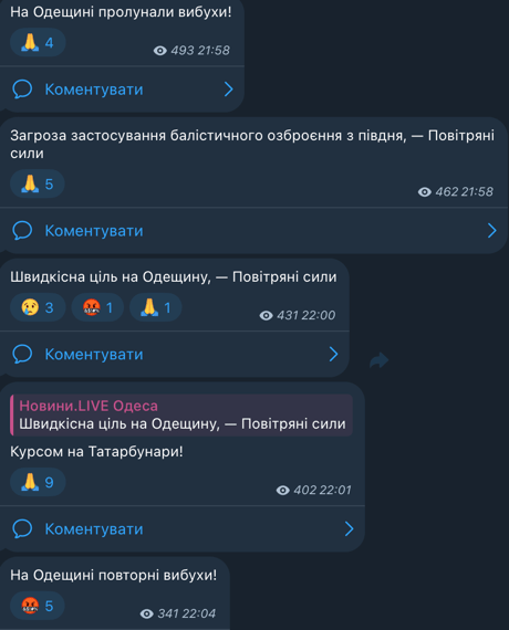 У Повітряних силах ЗСУ повідомляли про швидкісні цілі в напрямку Одеської області. Крім того, існує загроза застосування балістичного озброєння з півдня.