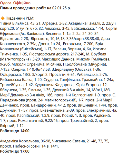Сьогодні, 2 січня, в Одесі не передбачені стабілізаційні відключення світла. Але у деяких районах міста заплановані ремонтні роботи на електромережах. Час та адреси ремонтів можуть змінюватися протягом дня, про це попередять заздалегідь.