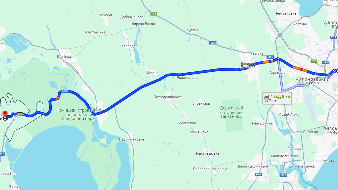 Наразі у бік пункту пропуску "Паланка — Маяки — Удобне" є затори на виїзді з Одеси, а також у районі природного парку та молдавського КПП. Ці ділянки на картах позначені червоним кольором. Подорож до Паланки триватиме сьогодні 1 годину 8 хвилин.