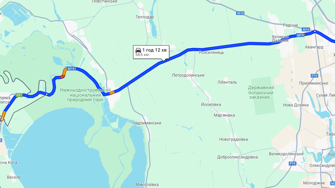 На міжнародній трасі М-15 на півдні Одеської області зафіксовано скупчення машин в межах Сарати, Зорі, Татарбунарів, Кирничок та Саф'ян. Проте варто зазначити, що розміри цих заторів суттєво не впливають на трафік. На самому поромному пункті пропуску теж невелика черга.