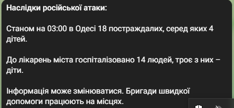 Повідомляється, що станом на 03:00 в Одесі 18 постраждалих, серед яких 4 дітей. До лікарень міста госпіталізовані 14 людей, троє з них — діти.