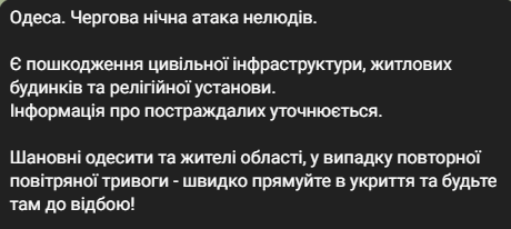 "Шановні одесити та жителі області, у випадку повторної повітряної тривоги — швидко прямуйте в укриття та будьте там до відбою! Окремо звертаюсь до адміністраторів телеграм-каналів та блогерів: не викладайте зараз наслідки ворожих атак! Не допомагайте ворогу!" — написав чиновник.