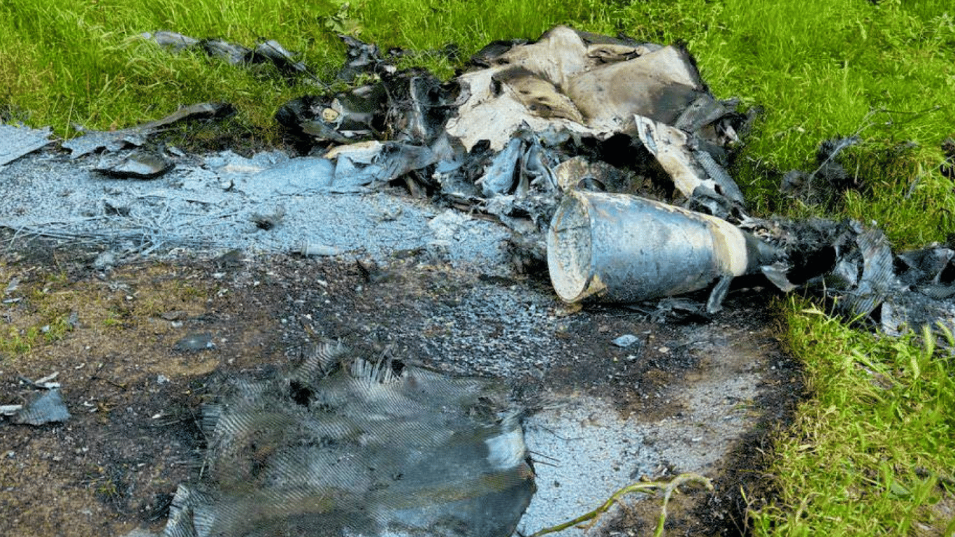 На фото видно уламки збитого БпЛА та вигорілу траву. Зазначимо, що наразі невідомо, чи це ударний дрон, чи розвідувальний.