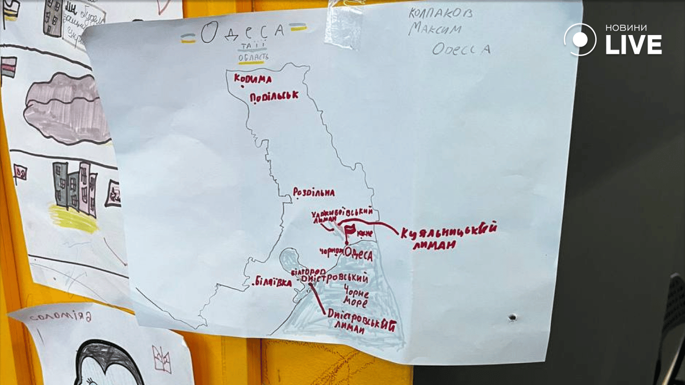 Маленькі одесити, що шукають притулок у Варшаві, знаходять втіху та вираз своїх почуттів у мистецькій формі. У залі тимчасового розміщення розгорнувся особливий куток дитячих малюнків, серед них — майже детальна мапа Одеської області. На ній значиться ім’я автора — Максим Колпаков, Одеса.