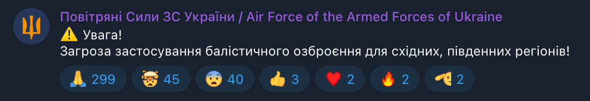 Моніторингові канали повідомляють про балістичну небезпеку у південних регіонах. Також існує загроза для сходу.