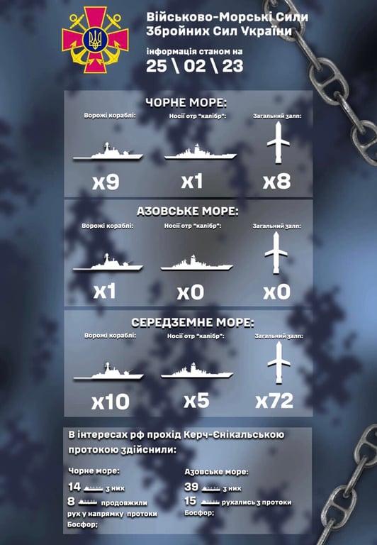 В повідомленні зазначається, що в Чорному морі на бойовому чергуванні знаходиться дев'ять ворожих кораблів, серед яких один носій крилатих ракет "Калібр" із загальним залпом у вісім ракет. Також зафіксовано один ворожий корабель в Азовському морі. Однак найбільше угрупувування російських кораблів у морі, що не омиває Україну.