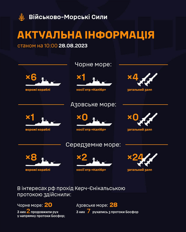 Станом на сьогодні, 28 серпня, в Чорному морі на бойовому чергуванні залишаються великі десантні кораблі РФ. Також з Азова росіяни вивели підводний ракетоносій.