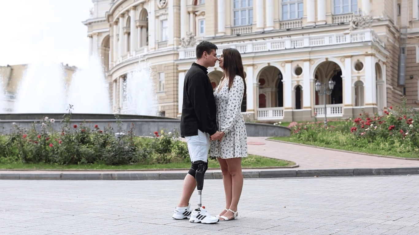 У самому центрі Одеси, біля національного академічного театру опери та балету, ветеран війни зробив романтичне освідчення своїй дівчині. Хлопець, стоячи на протезі, зробив коханій пропозицію.