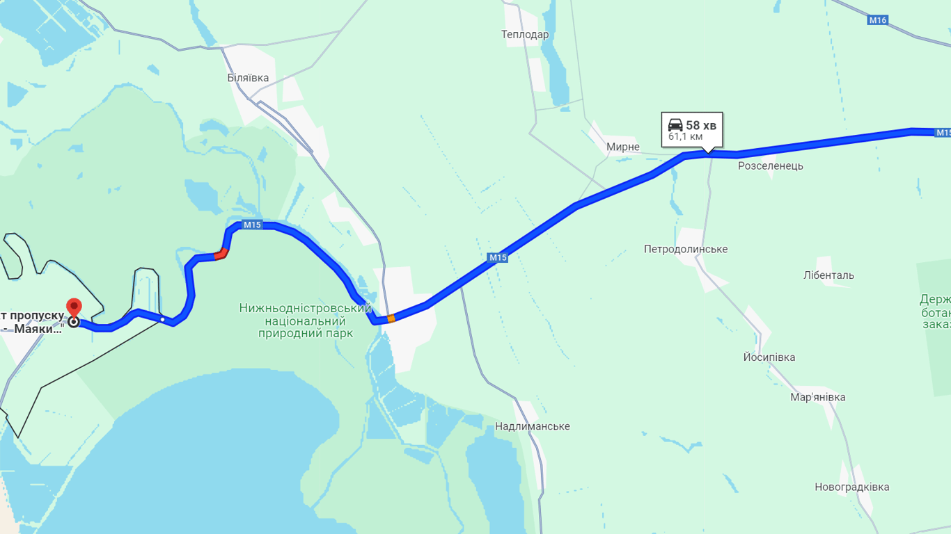 Наразі у бік пункту пропуску "Паланка — Маяки — Удобне" є затор у районі села Маяки та КПП, що розміщується у межах Нижньодністровського національного природного парку. Ці ділянки на картах позначені помаранчевим кольором. На самому автомобільному пункті пропуску черги не спостерігаються.