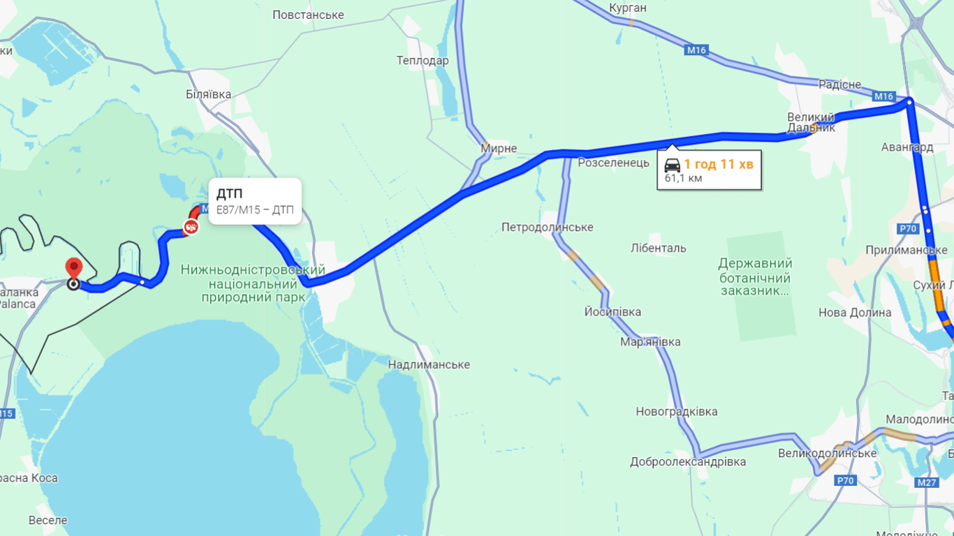 Наразі у бік пункту пропуску "Паланка — Маяки — Удобне" є затор у районі Сухого Лиману та перед КПП. На останній ділянці, за даними карт, сталася ДТП. Подорож до Паланки триватиме сьогодні ввечері понад годину. Також є черги на самому кордоні.