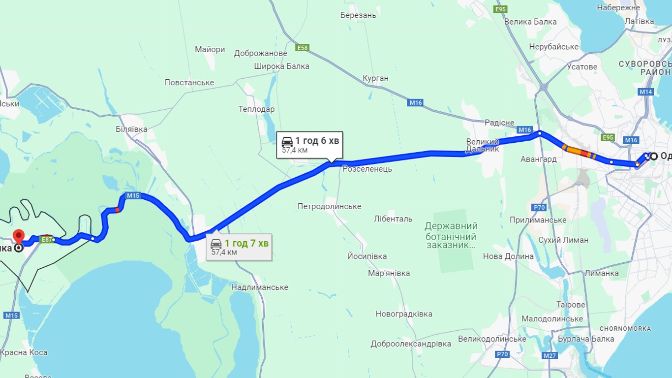 Наразі у бік пункту пропуску "Паланка — Маяки — Удобне" є затор на виїзді з Одеси, а також у районі природного парку та молдавського КПП. Ця ділянка на картах позначена червоним кольором. Подорож до Паланки триватиме сьогодні 1 годину 6 хвилин.