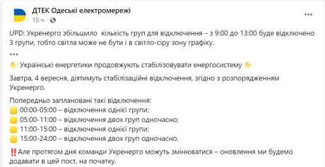 Окрім цього, сьогодні зранку світла буде менше ніж вчора передбачалося. За інформацією ДТЕК Одеські електромережі з 9:00 до 13:00 буде відключено одразу 3 групи, замість одної, тобто світла може не бути й у світло-сіру зону графіку.