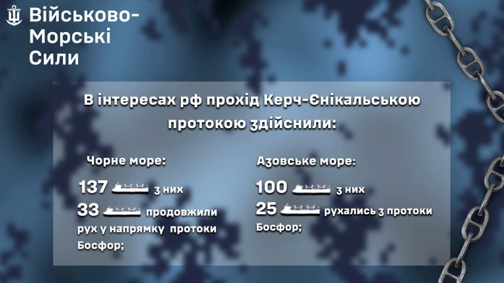 - до Азовського моря — 100 суден, з них 25 суден рухались з протоки Босфор;