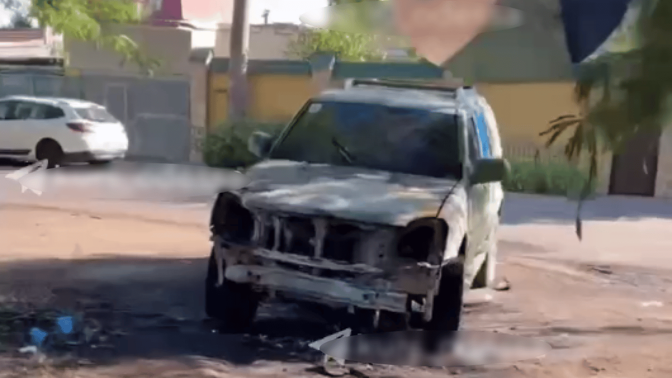 На відео видно, що у автомобіля повністю вигорів капот та спалені шини. Уламки лежать на землі поряд з пошкодженим транспортом.